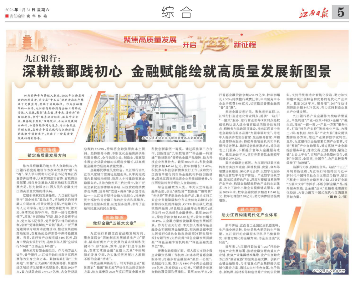 時(shí)光的腳步即將邁入春天,2026年江西省兩會(huì)的勝利召開,為全省“十五五”規(guī)劃開局之年擘畫了發(fā)展藍(lán)圖、明確了實(shí)踐路徑。作為金融贛軍的一分子,九江銀行始終踐行金融工作的政治性、人民性,聚焦“走在前、勇爭(zhēng)先、善作為”的目標(biāo)要求,堅(jiān)守“服務(wù)地方經(jīng)濟(jì)、服務(wù)中小企業(yè)、服務(wù)城鄉(xiāng)居民”市場(chǎng)定位,與地方發(fā)展同向而行,與實(shí)體經(jīng)濟(jì)同向發(fā)力,與社會(huì)民生同頻共振,在助力中國(guó)式現(xiàn)代化江西建設(shè)的浪潮中創(chuàng)新實(shí)干,交出了一份高質(zhì)量發(fā)展的精彩答卷。